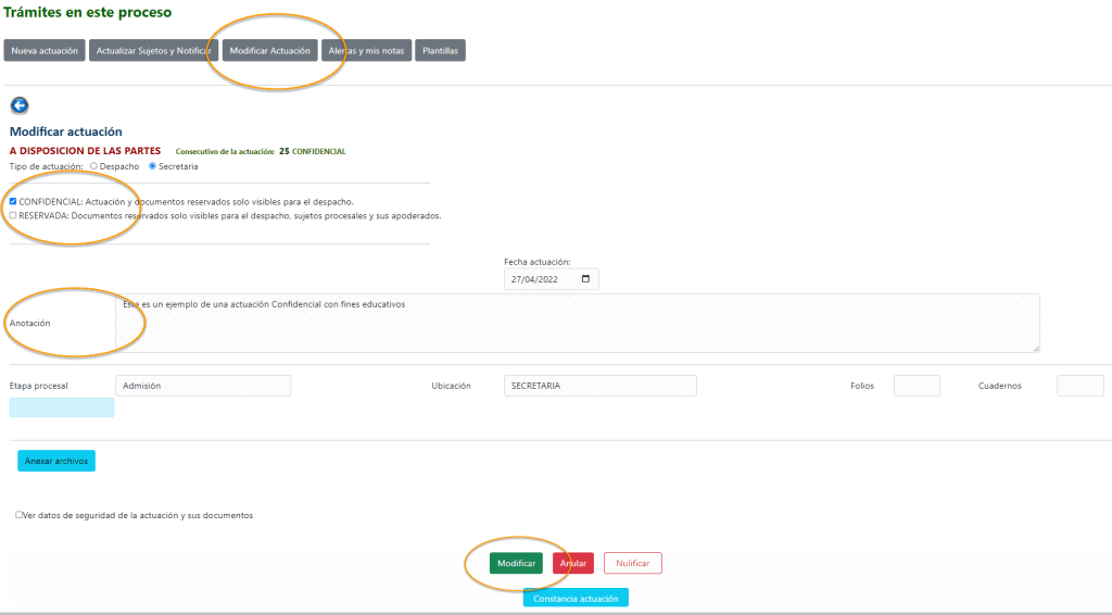 - Verifique en el historial de actuaciones que la actuación quede como pública, ahora aparecerá en “Estado” como “Modificada”.
