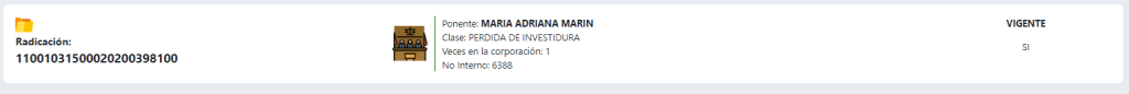 En la parte inicial de la pantalla el sistema resalta la información principal del proceso como numero de radicación, ponente, clase, las veces en la corporación, número interno y si está vigente o no.