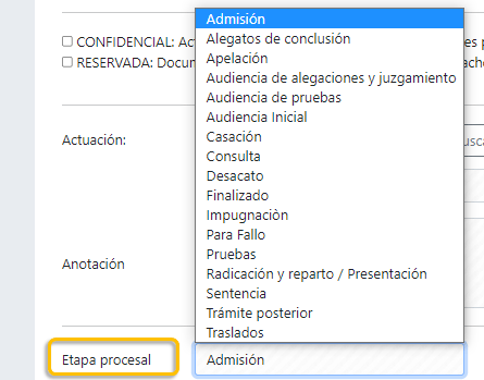 - Seleccione la etapa procesal a la que corresponda la actuación.