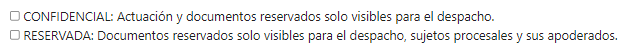 - Establezca si los documentos podrán ser vistos sólo por el despacho, los sujetos procesales y sus apoderados. Para esto active la casilla RESERVADA, los documentos quedarán como copia y no podrán ser observado ni descargados a través de la consulta de procesos ni por los usuarios internos del Consejo de Estado..