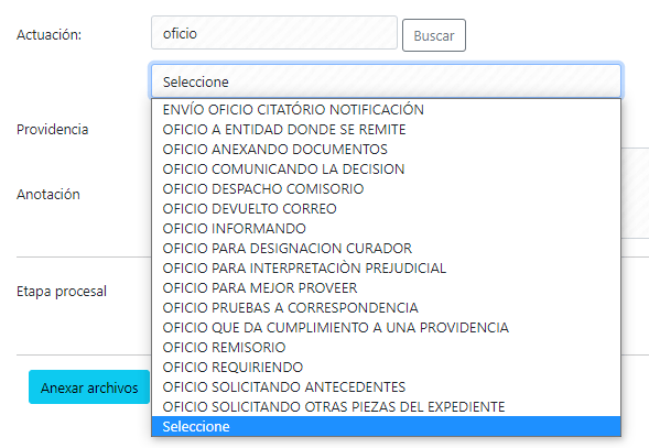 - Digite en la casilla buscar, el nombre de la actuación a registrar y luego seleccione una de las opciones del menú desplegable; una vez seleccionada, el sistema asigna de manera automática el tipo de providencia.