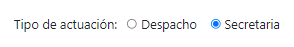 - Seleccione el tipo de actuación: de despacho o secretaría; las actuaciones creadas de despacho exigen adjuntar documentación.