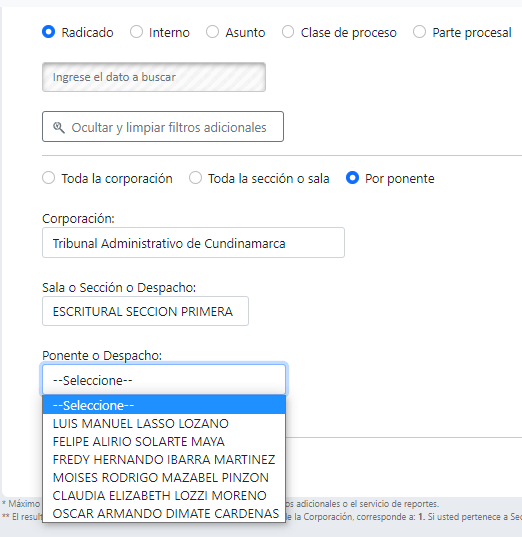 Sólo el ponente seleccionado: Al seleccionar esta opción primero deberá determinar, la corporación y la sala o sección, donde pertenece el ponente requerido.
