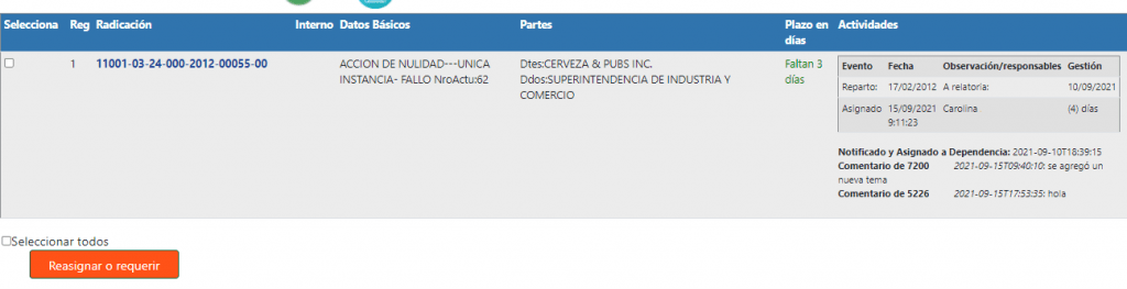 Desde esta opción, el relator podrá reasignar una providencia en el caso que lo requiera, para ser asignada a otro integrante del grupo. Para ello, deberá seleccionar la providencia y hacer clic en el botón Reasignar o requerir.